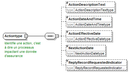 | source | <xsd:complexType name="Actiontype"> <xsd:annotation> <xsd:appinfo source="tb2Semantics">A process of any kind having influence on an insurance issue (contract, claim, premium notification, ...).</xsd:appinfo> <xsd:appinfo source="tb2Edifact">(ACT)</xsd:appinfo> <xsd:documentation source="BusinessDefinition" xml:lang="fr">Identifie une action, c'est à dire un processus impactant une donnée d'assurance</xsd:documentation> <xsd:documentation source="BusinessDefinition" xml:lang="nl">Identificeert een actie, zijnde een of ander proces met een of andere uitwerking op een verzekeringsgegeven. </xsd:documentation> <xsd:documentation source="BusinessDefinition" xml:lang="en">A process of any kind having influence on an insurance issue (contract, claim, premium notification, ...).</xsd:documentation> <xsd:documentation source="BusinessTerm" xml:lang="en">Action</xsd:documentation> <xsd:documentation source="BusinessTerm" xml:lang="nl">Aktie</xsd:documentation> <xsd:documentation source="BusinessTerm" xml:lang="fr">Action</xsd:documentation> <xsd:documentation source="BusinessTerm" xml:lang="ge">Aktion</xsd:documentation> </xsd:annotation> <xsd:sequence> <xsd:element name="ActionDescriptionText" type="ActionDescriptionTexttype" minOccurs="0"/> <xsd:element name="ActionDateAndTime" type="ActionDateAndTimetype" minOccurs="0"/> <xsd:element name="ActionEffectiveDate" type="ActionEffectiveDatetype" minOccurs="0"/> <xsd:element name="NextActionDate" type="NextActionDatetype" minOccurs="0"/> <xsd:element name="ReplyRecordRequestedIndicator" type="ReplyRecordRequestedIndicatortype" minOccurs="0"/> </xsd:sequence> </xsd:complexType> |