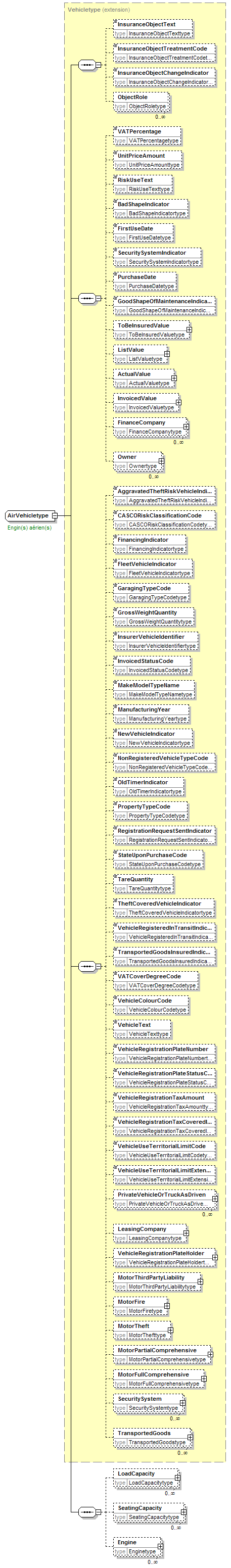 | children | InsuranceObjectText InsuranceObjectTreatmentCode InsuranceObjectChangeIndicator ObjectRole VATPercentage UnitPriceAmount RiskUseText BadShapeIndicator FirstUseDate SecuritySystemIndicator PurchaseDate GoodShapeOfMaintenanceIndicator ToBeInsuredValue ListValue ActualValue InvoicedValue FinanceCompany Owner AggravatedTheftRiskVehicleIndicator CASCORiskClassificationCode FinancingIndicator FleetVehicleIndicator GaragingTypeCode GrossWeightQuantity InsurerVehicleIdentifier InvoicedStatusCode MakeModelTypeName ManufacturingYear NewVehicleIndicator NonRegisteredVehicleTypeCode OldTimerIndicator PropertyTypeCode RegistrationRequestSentIndicator StateUponPurchaseCode TareQuantity TheftCoveredVehicleIndicator VehicleRegisteredInTransitIndicator TransportedGoodsInsuredIndicator VATCoverDegreeCode VehicleColourCode VehicleText VehicleRegistrationPlateNumber VehicleRegistrationPlateStatusCode VehicleRegistrationTaxAmount VehicleRegistrationTaxCoveredIndicator VehicleUseTerritorialLimitCode VehicleUseTerritorialLimitExtensionCode PrivateVehicleOrTruckAsDriven LeasingCompany VehicleRegistrationPlateHolder MotorThirdPartyLiability MotorFire MotorTheft MotorPartialComprehensive MotorFullComprehensive SecuritySystem TransportedGoods LoadCapacity SeatingCapacity Engine | ||||||||||||||||||