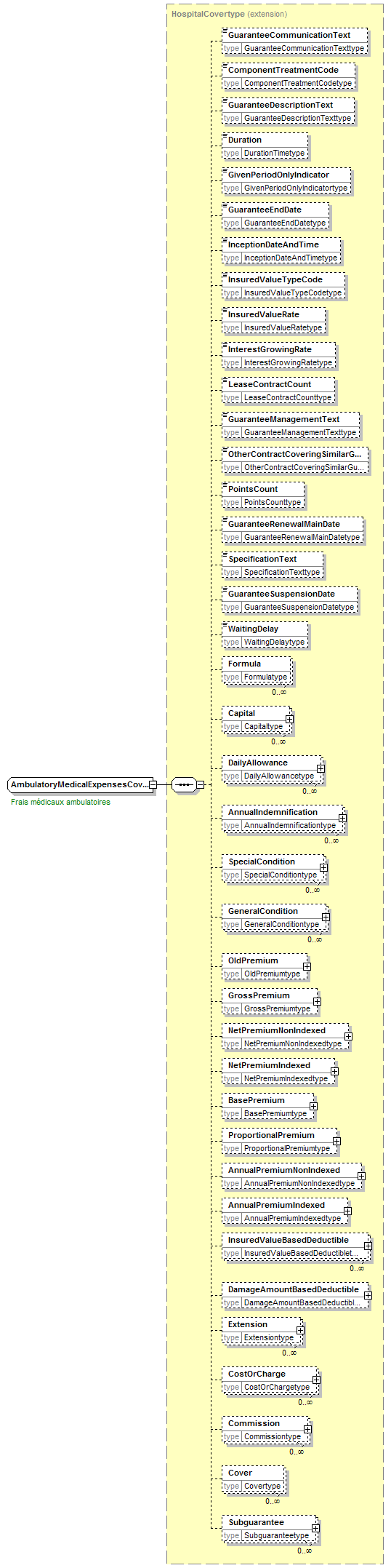 | source | <xsd:complexType name="AmbulatoryMedicalExpensesCovertype"> <xsd:annotation> <xsd:appinfo source="tb2Edifact">(ICD+238)</xsd:appinfo> <xsd:documentation source="BusinessTerm" xml:lang="fr">Frais médicaux ambulatoires</xsd:documentation> <xsd:documentation source="BusinessTerm" xml:lang="nl">Ambulante medische kosten</xsd:documentation> <xsd:documentation source="BusinessTerm" xml:lang="ge">Kosten für ambulante Behandlung</xsd:documentation> <xsd:documentation source="BusinessTerm" xml:lang="en">Ambulatory medical expenses</xsd:documentation> <xsd:documentation source="BusinessDefinition" xml:lang="fr">Garantie visant à rembourser les frais médicaux subis à l’occasion d’un traitement en dehors d’une hospitalisation, quel qu'en soit l’origine.</xsd:documentation> <xsd:documentation source="BusinessDefinition" xml:lang="nl">Waarborg die de medische kosten van een behandeling buiten hospitaal dekt, ongeacht de oorzaak ervan.</xsd:documentation> <xsd:documentation source="BusinessDefinition" xml:lang="en">Guarantee - Covering medical treatment expenses, outside a hospitalization.</xsd:documentation> </xsd:annotation> <xsd:complexContent> <xsd:extension base="HospitalCovertype"/> </xsd:complexContent> </xsd:complexType> |