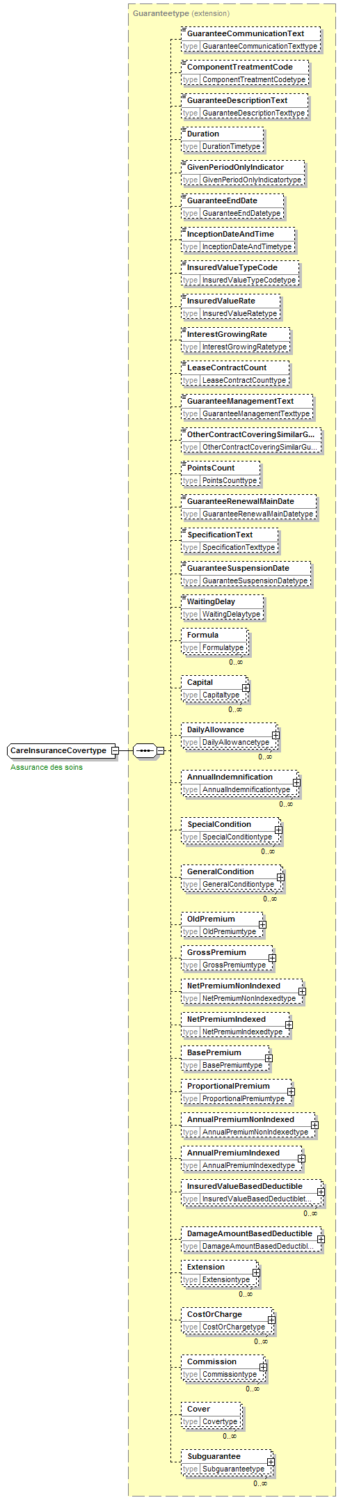 | children | GuaranteeCommunicationText ComponentTreatmentCode GuaranteeDescriptionText Duration GivenPeriodOnlyIndicator GuaranteeEndDate InceptionDateAndTime InsuredValueTypeCode InsuredValueRate InterestGrowingRate LeaseContractCount GuaranteeManagementText OtherContractCoveringSimilarGuaranteeIndicator PointsCount GuaranteeRenewalMainDate SpecificationText GuaranteeSuspensionDate WaitingDelay Formula Capital DailyAllowance AnnualIndemnification SpecialCondition GeneralCondition OldPremium GrossPremium NetPremiumNonIndexed NetPremiumIndexed BasePremium ProportionalPremium AnnualPremiumNonIndexed AnnualPremiumIndexed InsuredValueBasedDeductible DamageAmountBasedDeductible Extension CostOrCharge Commission Cover Subguarantee | ||||||||||||||||