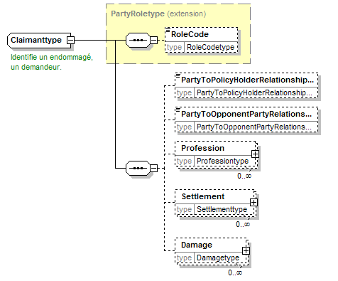 | source | <xsd:complexType name="Claimanttype"> <xsd:annotation> <xsd:appinfo source="tb2Semantics">The person (policyholder or beneficiary) seeking payment or settlement under the terms of a policy.</xsd:appinfo> <xsd:appinfo source="tb2Edifact">(DPT)</xsd:appinfo> <xsd:documentation source="BusinessDefinition" xml:lang="fr">Identifie un endommagé, un demandeur.</xsd:documentation> <xsd:documentation source="BusinessDefinition" xml:lang="nl">Identificeert een schade-eiser.</xsd:documentation> <xsd:documentation source="BusinessDefinition" xml:lang="en">Claimant - The person (policyholder or beneficiary) seeking payment or settlement under the terms of a policy.</xsd:documentation> <xsd:documentation source="BusinessTerm" xml:lang="en">Claimant</xsd:documentation> <xsd:documentation source="BusinessTerm" xml:lang="nl">Eiser</xsd:documentation> <xsd:documentation source="BusinessTerm" xml:lang="fr">Revendicateur</xsd:documentation> </xsd:annotation> <xsd:complexContent> <xsd:extension base="PartyRoletype"> <xsd:sequence> <xsd:element name="PartyToPolicyHolderRelationshipTypeCode" type="PartyToPolicyHolderRelationshipTypeCodetype" minOccurs="0"/> <xsd:element name="PartyToOpponentPartyRelationshipTypeCode" type="PartyToOpponentPartyRelationshipTypeCodetype" minOccurs="0"/> <xsd:element name="Profession" type="Professiontype" minOccurs="0" maxOccurs="unbounded"/> <xsd:element name="Settlement" type="Settlementtype" minOccurs="0" maxOccurs="unbounded"/> <xsd:element name="Damage" type="Damagetype" minOccurs="0" maxOccurs="unbounded"/> </xsd:sequence> </xsd:extension> </xsd:complexContent> </xsd:complexType> |