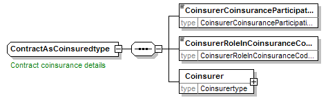 | source | <xsd:complexType name="ContractAsCoinsuredtype"> <xsd:annotation> <xsd:appinfo source="tb2Semantics">A contract can have coinsurers. (19.06.2007 former relationtype converted into entitytype)</xsd:appinfo> <xsd:documentation source="BusinessTerm" xml:lang="en">Contract coinsurance details</xsd:documentation> <xsd:documentation source="BusinessTerm" xml:lang="nl">Medeverzekeringsdetails</xsd:documentation> <xsd:documentation source="BusinessTerm" xml:lang="fr">Co-assurance, détails</xsd:documentation> </xsd:annotation> <xsd:sequence> <xsd:element name="CoinsurerCoinsuranceParticipationPercentage" type="CoinsurerCoinsuranceParticipationPercentagetype"/> <xsd:element name="CoinsurerRoleInCoinsuranceCode" type="CoinsurerRoleInCoinsuranceCodetype"/> <xsd:element name="Coinsurer" type="Coinsurertype"/> </xsd:sequence> </xsd:complexType> |