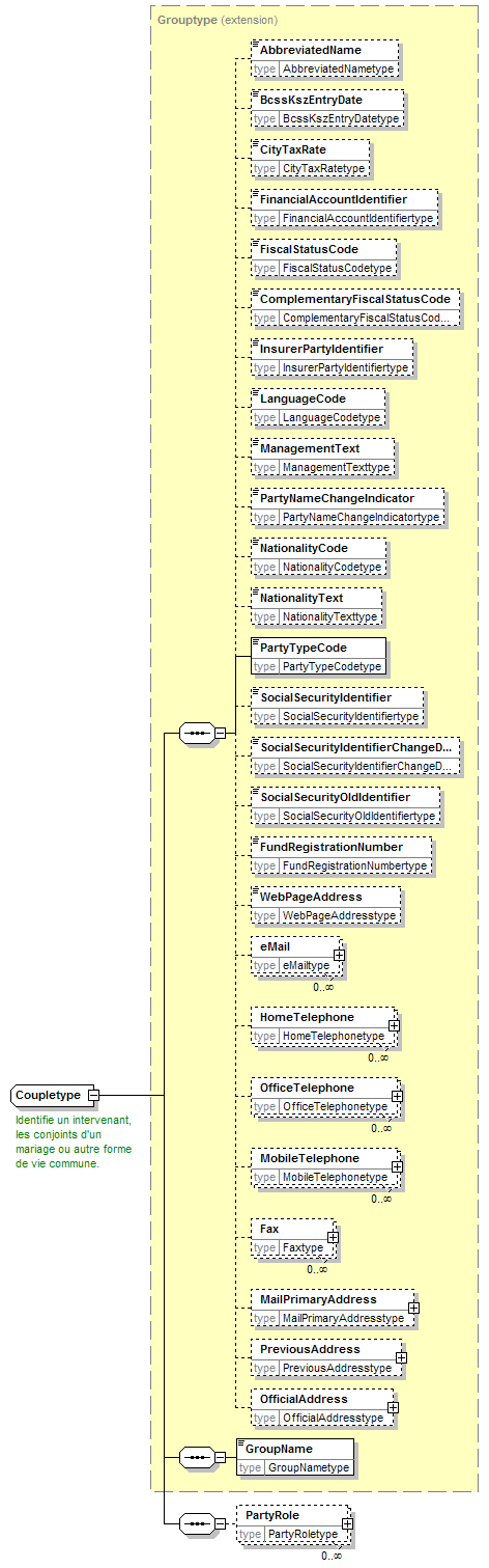 | source | <xsd:complexType name="Coupletype"> <xsd:annotation> <xsd:appinfo source="tb2Semantics">A pair of people who live together, usually husband and wife.</xsd:appinfo> <xsd:appinfo source="tb2Edifact">(PTY)</xsd:appinfo> <xsd:documentation source="BusinessDefinition" xml:lang="fr">Identifie un intervenant, les conjoints d'un mariage ou autre forme de vie commune.</xsd:documentation> <xsd:documentation source="BusinessDefinition" xml:lang="nl">Identificeert een betrokkene, in voorkomend geval man en vrouw.</xsd:documentation> <xsd:documentation source="BusinessDefinition" xml:lang="en">Party - A pair of people who live together, usually husband and wife.</xsd:documentation> <xsd:documentation source="BusinessTerm" xml:lang="en">Couple</xsd:documentation> <xsd:documentation source="BusinessTerm" xml:lang="nl">Koppel</xsd:documentation> <xsd:documentation source="BusinessTerm" xml:lang="fr">Couple</xsd:documentation> </xsd:annotation> <xsd:complexContent> <xsd:extension base="Grouptype"> <xsd:sequence> <xsd:element name="PartyRole" type="PartyRoletype" minOccurs="0" maxOccurs="unbounded"/> </xsd:sequence> </xsd:extension> </xsd:complexContent> </xsd:complexType> |