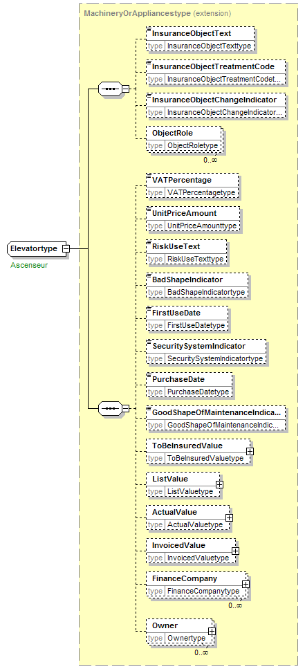 | source | <xsd:complexType name="Elevatortype"> <xsd:annotation> <xsd:appinfo source="tb2Semantics">Usually in buildings, vertical transportation means for goods or humans.</xsd:appinfo> <xsd:appinfo source="tb2Edifact">(ROD+125)</xsd:appinfo> <xsd:documentation source="BusinessTerm" xml:lang="fr">Ascenseur</xsd:documentation> <xsd:documentation source="BusinessTerm" xml:lang="nl">Lift</xsd:documentation> <xsd:documentation source="BusinessTerm" xml:lang="ge">Lift</xsd:documentation> <xsd:documentation source="BusinessTerm" xml:lang="en">Elevator</xsd:documentation> <xsd:documentation source="BusinessDefinition" xml:lang="fr">Dans un bâtiment, moyen de transport à la verticale.</xsd:documentation> <xsd:documentation source="BusinessDefinition" xml:lang="nl">Meestal in een gebouw, een middel voor verticaal transport</xsd:documentation> <xsd:documentation source="BusinessDefinition" xml:lang="en">Risk Object - Usually in buildings, vertical transportation means for goods or humans.</xsd:documentation> </xsd:annotation> <xsd:complexContent> <xsd:extension base="MachineryOrAppliancestype"/> </xsd:complexContent> </xsd:complexType> |