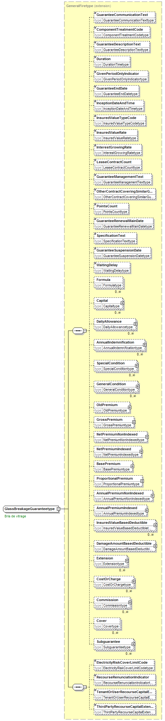 | children | GuaranteeCommunicationText ComponentTreatmentCode GuaranteeDescriptionText Duration GivenPeriodOnlyIndicator GuaranteeEndDate InceptionDateAndTime InsuredValueTypeCode InsuredValueRate InterestGrowingRate LeaseContractCount GuaranteeManagementText OtherContractCoveringSimilarGuaranteeIndicator PointsCount GuaranteeRenewalMainDate SpecificationText GuaranteeSuspensionDate WaitingDelay Formula Capital DailyAllowance AnnualIndemnification SpecialCondition GeneralCondition OldPremium GrossPremium NetPremiumNonIndexed NetPremiumIndexed BasePremium ProportionalPremium AnnualPremiumNonIndexed AnnualPremiumIndexed InsuredValueBasedDeductible DamageAmountBasedDeductible Extension CostOrCharge Commission Cover Subguarantee ElectricityRiskCoverLimitCode RecourseRenunciationIndicator TenantOrUserRecourseCapitalExtensionAmount ThirdPartyRecourseCapitalExtensionAmount | ||||||||||||||