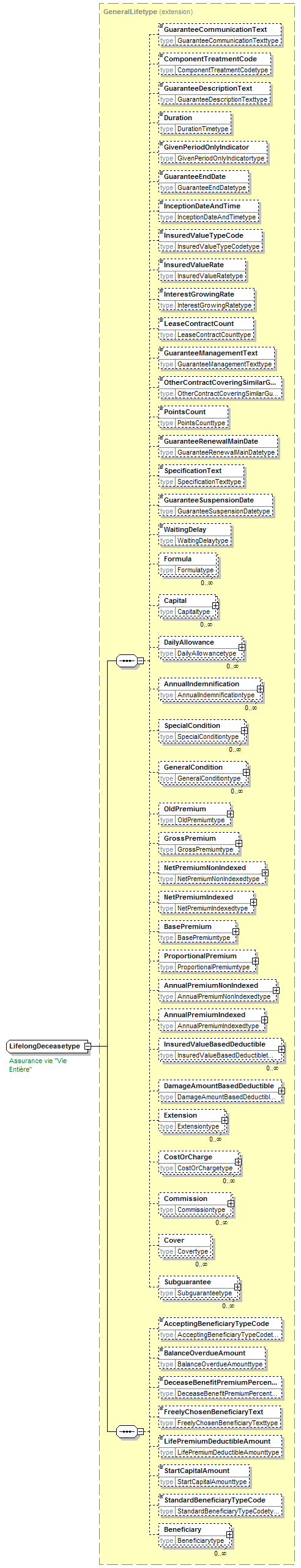 | source | <xsd:complexType name="LifelongDeceasetype"> <xsd:annotation> <xsd:appinfo source="tb2Edifact">(ICD+123)</xsd:appinfo> <xsd:documentation source="BusinessTerm" xml:lang="fr">Assurance vie "Vie Entière"</xsd:documentation> <xsd:documentation source="BusinessTerm" xml:lang="nl">"Levenslange" levensverzekering</xsd:documentation> <xsd:documentation source="BusinessTerm" xml:lang="ge">Sterbensversicherung (Lebenslänglich)</xsd:documentation> <xsd:documentation source="BusinessTerm" xml:lang="en">Permanent decease insurance</xsd:documentation> <xsd:documentation source="BusinessDefinition" xml:lang="fr">Assurance qui ne s’expire que lors du décès de l’assuré et par laquelle une compagnie s’engage à verser un montant convenu au moment du décès. Il y a (au contraire de l’assurance temporaire décès) toujours prestation de l’assureur.</xsd:documentation> <xsd:documentation source="BusinessDefinition" xml:lang="nl">Verzekering die slechts afloopt ter gelegenheid van het overlijden van de verzekerde en waarbij de maatschappij zich ertoe verbindt op het ogenblik van het overlijden een overeengekomen bedrag te betalen. Er is dus (in tegenstelling tot de tijdelijke verzekering overlijden) steeds een prestatie van de verzekeraar.</xsd:documentation> <xsd:documentation source="BusinessDefinition" xml:lang="en">Guarantee - Based on the death of the insured person, in an infinite time-period.</xsd:documentation> </xsd:annotation> <xsd:complexContent> <xsd:extension base="GeneralLifetype"/> </xsd:complexContent> </xsd:complexType> |