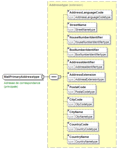| source | <xsd:complexType name="MailPrimaryAddresstype"> <xsd:annotation> <xsd:appinfo source="tb2Semantics">Structured description by means of street, house number, etc. of the place where postal mail is to be send to.</xsd:appinfo> <xsd:appinfo source="tb2Edifact">(ADR+007)</xsd:appinfo> <xsd:documentation source="BusinessTerm" xml:lang="fr">Adresse de correspondance (principale)</xsd:documentation> <xsd:documentation source="BusinessTerm" xml:lang="nl">Correspondentieadres (hoofd-)</xsd:documentation> <xsd:documentation source="BusinessTerm" xml:lang="ge">Postanschrift</xsd:documentation> <xsd:documentation source="BusinessTerm" xml:lang="en">Postal address</xsd:documentation> <xsd:documentation source="BusinessDefinition" xml:lang="fr">Description structurée sous forme de rue, numéro de maison, ... du lieu auquel le courier doit être envoyé au cas où ce lieu est différent de l'adresse (officielle).</xsd:documentation> <xsd:documentation source="BusinessDefinition" xml:lang="nl">Gestructureerde beschrijving door middel van straat, huisnummer, ... van de plaats waarnaar briefwisseling gestuurd moet worden indien deze plaats verschilt van het (officiële) adres.</xsd:documentation> <xsd:documentation source="BusinessDefinition" xml:lang="en">Address</xsd:documentation> </xsd:annotation> <xsd:complexContent> <xsd:extension base="Addresstype"/> </xsd:complexContent> </xsd:complexType> |