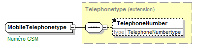 | source | <xsd:complexType name="MobileTelephonetype"> <xsd:annotation> <xsd:appinfo source="tb2Semantics">A telephone that can be moved around.</xsd:appinfo> <xsd:appinfo source="tb2Edifact">(COM+007)</xsd:appinfo> <xsd:documentation source="BusinessTerm" xml:lang="fr">Numéro GSM</xsd:documentation> <xsd:documentation source="BusinessTerm" xml:lang="nl">GSM nummer</xsd:documentation> <xsd:documentation source="BusinessTerm" xml:lang="ge">Mobiltelefonnummer</xsd:documentation> <xsd:documentation source="BusinessTerm" xml:lang="en">Mobile telephone number</xsd:documentation> <xsd:documentation source="BusinessDefinition" xml:lang="fr">Le numéro qu'il faut former pour réaliser une connexion avec un téléphone portable.</xsd:documentation> <xsd:documentation source="BusinessDefinition" xml:lang="nl">Het nummer dat men moet vormen om met een mobiele telefoon in verbinding te treden.</xsd:documentation> <xsd:documentation source="BusinessDefinition" xml:lang="en">Communication contacts</xsd:documentation> </xsd:annotation> <xsd:complexContent> <xsd:extension base="Telephonetype"/> </xsd:complexContent> </xsd:complexType> |