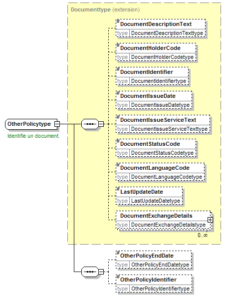 | children | DocumentDescriptionText DocumentHolderCode DocumentIdentifier DocumentIssueDate DocumentIssueServiceText DocumentStatusCode DocumentLanguageCode LastUpdateDate DocumentExchangeDetails OtherPolicyEndDate OtherPolicyIdentifier | ||||||||||||||