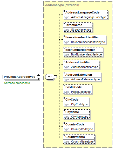 | source | <xsd:complexType name="PreviousAddresstype"> <xsd:annotation> <xsd:appinfo source="tb2Semantics">Structured description by means of street, house number, etc. of the place where the party was registered previously.</xsd:appinfo> <xsd:appinfo source="tb2Edifact">(ADR+003)</xsd:appinfo> <xsd:documentation source="BusinessTerm" xml:lang="fr">Adresse précédente</xsd:documentation> <xsd:documentation source="BusinessTerm" xml:lang="nl">Vorige adres</xsd:documentation> <xsd:documentation source="BusinessTerm" xml:lang="ge">Frühere Adresse</xsd:documentation> <xsd:documentation source="BusinessTerm" xml:lang="en">Previous address</xsd:documentation> <xsd:documentation source="BusinessDefinition" xml:lang="fr">Description structurée sous forme de rue, numéro de maison, ... du lieu sous lequel l'intervenant était inscrit précédemment dans le registre de la population ou de commerce.</xsd:documentation> <xsd:documentation source="BusinessDefinition" xml:lang="nl">Gestructureerde beschrijving door middel van straat, huisnummer, ... van de vorige plaats waaronder een betrokkene in het bevolkingsregister of het handelsregister ingeschreven was.</xsd:documentation> <xsd:documentation source="BusinessDefinition" xml:lang="en">Address</xsd:documentation> </xsd:annotation> <xsd:complexContent> <xsd:extension base="Addresstype"/> </xsd:complexContent> </xsd:complexType> |