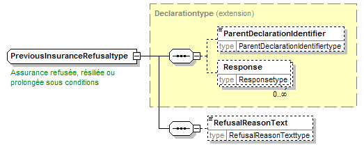 | source | <xsd:complexType name="PreviousInsuranceRefusaltype"> <xsd:annotation> <xsd:appinfo source="tb2Semantics">A refusal in the past of insurance to this proposer/policyholder</xsd:appinfo> <xsd:appinfo source="tb2Edifact">(QRS+5V0S)</xsd:appinfo> <xsd:documentation source="BusinessTerm" xml:lang="fr">Assurance refusée, résiliée ou prolongée sous conditions</xsd:documentation> <xsd:documentation source="BusinessTerm" xml:lang="nl">Verzekering geweigerd, opgezegd of verdergezet mits voorwaarden</xsd:documentation> <xsd:documentation source="BusinessTerm" xml:lang="ge">Versicherung verweigert, aufgekündigt oder verlängert</xsd:documentation> <xsd:documentation source="BusinessTerm" xml:lang="en">Insurance refused, ended or extended providing conditions</xsd:documentation> <xsd:documentation source="BusinessDefinition" xml:lang="fr">Une compagnie a-t-elle à un moment donné refusée, résiliée ou prolongée l'assurance sous certaines conditions particulières ? -- Une compagnie a-t-elle à un moment donné refusée, résiliée ou prolongée l'assurance sous certaines conditions particulières ?</xsd:documentation> <xsd:documentation source="BusinessDefinition" xml:lang="nl">Heeft een maatschappij de verzekering ooit geweigerd, opgezegd of slechts onder bijzondere voorwaarden willen aanvaarden of verder zetten ? -- Heeft een maatschappij de verzekering ooit geweigerd, opgezegd of slechts onder bijzondere voorwaarden willen aanvaarden of verder zetten ?</xsd:documentation> <xsd:documentation source="BusinessDefinition" xml:lang="en">Declaration</xsd:documentation> </xsd:annotation> <xsd:complexContent> <xsd:extension base="Declarationtype"> <xsd:sequence> <xsd:element name="RefusalReasonText" type="RefusalReasonTexttype" minOccurs="0"/> </xsd:sequence> </xsd:extension> </xsd:complexContent> </xsd:complexType> |