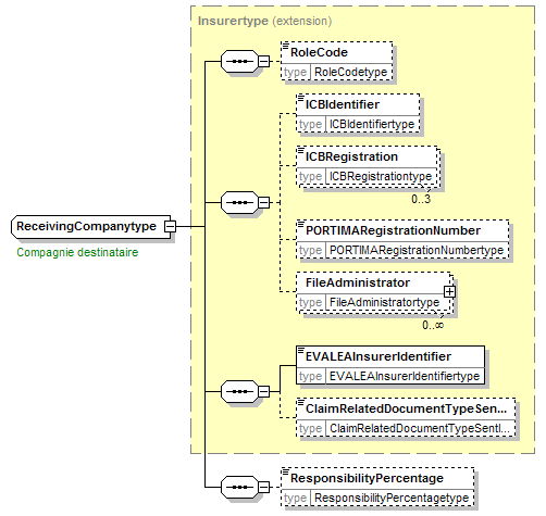| source | <xsd:complexType name="ReceivingCompanytype"> <xsd:annotation> <xsd:appinfo source="tb2Semantics">The insurer acting as recipient of the data.</xsd:appinfo> <xsd:appinfo source="tb2Edifact">(PTY+044)</xsd:appinfo> <xsd:documentation source="BusinessTerm" xml:lang="fr">Compagnie destinataire</xsd:documentation> <xsd:documentation source="BusinessTerm" xml:lang="nl">Bestemmeling-maatschappij</xsd:documentation> <xsd:documentation source="BusinessTerm" xml:lang="ge">Adressierte Gesellschaft</xsd:documentation> <xsd:documentation source="BusinessTerm" xml:lang="en">Receiving company</xsd:documentation> <xsd:documentation source="BusinessDefinition" xml:lang="fr">Identifie un intervenant.</xsd:documentation> <xsd:documentation source="BusinessDefinition" xml:lang="nl">Identificeert een betrokkene.</xsd:documentation> <xsd:documentation source="BusinessDefinition" xml:lang="en">Party</xsd:documentation> </xsd:annotation> <xsd:complexContent> <xsd:extension base="Insurertype"> <xsd:sequence> <xsd:element name="ResponsibilityPercentage" type="ResponsibilityPercentagetype" minOccurs="0"/> </xsd:sequence> </xsd:extension> </xsd:complexContent> </xsd:complexType> |