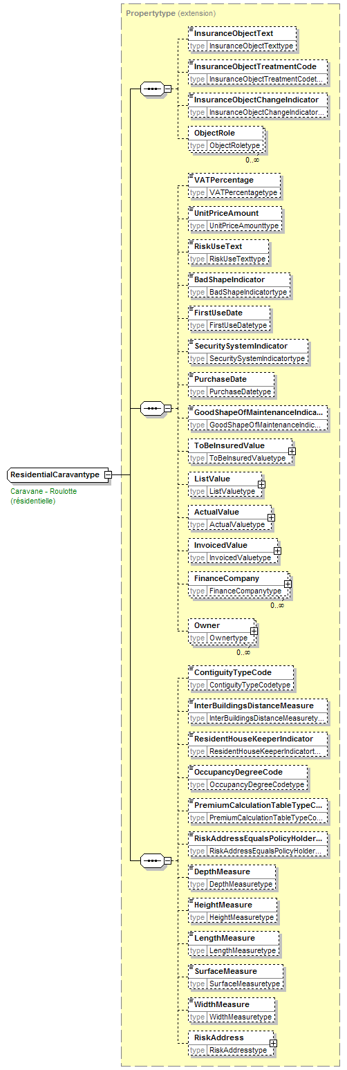 | source | <xsd:complexType name="ResidentialCaravantype"> <xsd:annotation> <xsd:appinfo source="tb2Semantics">A trailer equipped with living quarters used for permanent residency.</xsd:appinfo> <xsd:appinfo source="tb2Edifact">(ROD+012)</xsd:appinfo> <xsd:documentation source="BusinessTerm" xml:lang="fr">Caravane - Roulotte (résidentielle)</xsd:documentation> <xsd:documentation source="BusinessTerm" xml:lang="nl">Woonwagen - stacaravan (residentieel)</xsd:documentation> <xsd:documentation source="BusinessTerm" xml:lang="ge">Wohnwagen - Caravan mit festem Standplatz</xsd:documentation> <xsd:documentation source="BusinessTerm" xml:lang="en">Caravan</xsd:documentation> <xsd:documentation source="BusinessDefinition" xml:lang="fr">Identifie une personne ou une chose placée sous la garantie de l'assurance. Un objet de risque est l'indication, dans la police, d'un objet assuré. Plusieurs objets de risque peuvent être assurés dans le cadre d'une seule police.<br/>Exemples : un véhicul</xsd:documentation> <xsd:documentation source="BusinessDefinition" xml:lang="nl">Identificeert een persoon of een zaak, onderwerp van waarborg in een verzekering. Een risico-object is de aanduiding, binnen de polis, van een verzekerd voorwerp. Binnen één polis kunnen er meerdere risico-objecten verzekerd zijn.<br/>Voorbeelden : een vo</xsd:documentation> <xsd:documentation source="BusinessDefinition" xml:lang="en">Risk Object</xsd:documentation> </xsd:annotation> <xsd:complexContent> <xsd:extension base="Propertytype"/> </xsd:complexContent> </xsd:complexType> |