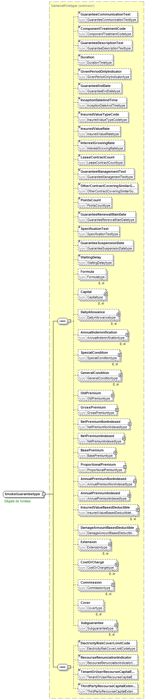 | children | GuaranteeCommunicationText ComponentTreatmentCode GuaranteeDescriptionText Duration GivenPeriodOnlyIndicator GuaranteeEndDate InceptionDateAndTime InsuredValueTypeCode InsuredValueRate InterestGrowingRate LeaseContractCount GuaranteeManagementText OtherContractCoveringSimilarGuaranteeIndicator PointsCount GuaranteeRenewalMainDate SpecificationText GuaranteeSuspensionDate WaitingDelay Formula Capital DailyAllowance AnnualIndemnification SpecialCondition GeneralCondition OldPremium GrossPremium NetPremiumNonIndexed NetPremiumIndexed BasePremium ProportionalPremium AnnualPremiumNonIndexed AnnualPremiumIndexed InsuredValueBasedDeductible DamageAmountBasedDeductible Extension CostOrCharge Commission Cover Subguarantee ElectricityRiskCoverLimitCode RecourseRenunciationIndicator TenantOrUserRecourseCapitalExtensionAmount ThirdPartyRecourseCapitalExtensionAmount | ||||||||||||||