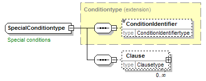 | source | <xsd:complexType name="SpecialConditiontype"> <xsd:annotation> <xsd:appinfo source="tb2Semantics">The conditions applying to or characterised by or distinguishing this contract/guarantee.</xsd:appinfo> <xsd:documentation source="BusinessTerm" xml:lang="en">Special conditions</xsd:documentation> <xsd:documentation source="BusinessTerm" xml:lang="nl">Bijzondere voorwaarden</xsd:documentation> <xsd:documentation source="BusinessTerm" xml:lang="fr">Conditions particulières</xsd:documentation> </xsd:annotation> <xsd:complexContent> <xsd:extension base="Conditiontype"> <xsd:sequence> <xsd:element name="Clause" type="Clausetype" minOccurs="0" maxOccurs="unbounded"/> </xsd:sequence> </xsd:extension> </xsd:complexContent> </xsd:complexType> |
