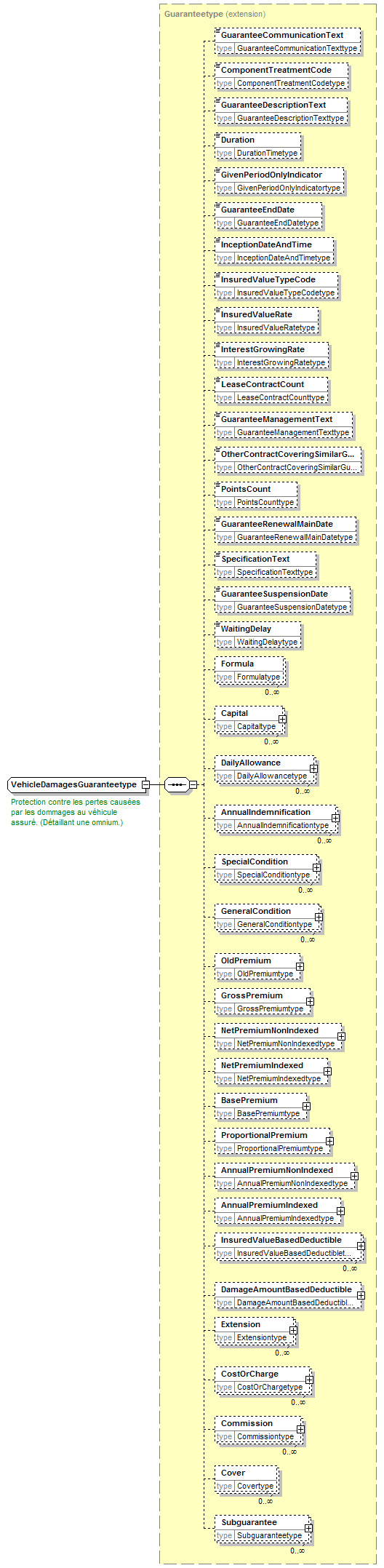 | children | GuaranteeCommunicationText ComponentTreatmentCode GuaranteeDescriptionText Duration GivenPeriodOnlyIndicator GuaranteeEndDate InceptionDateAndTime InsuredValueTypeCode InsuredValueRate InterestGrowingRate LeaseContractCount GuaranteeManagementText OtherContractCoveringSimilarGuaranteeIndicator PointsCount GuaranteeRenewalMainDate SpecificationText GuaranteeSuspensionDate WaitingDelay Formula Capital DailyAllowance AnnualIndemnification SpecialCondition GeneralCondition OldPremium GrossPremium NetPremiumNonIndexed NetPremiumIndexed BasePremium ProportionalPremium AnnualPremiumNonIndexed AnnualPremiumIndexed InsuredValueBasedDeductible DamageAmountBasedDeductible Extension CostOrCharge Commission Cover Subguarantee | ||||||||||||||